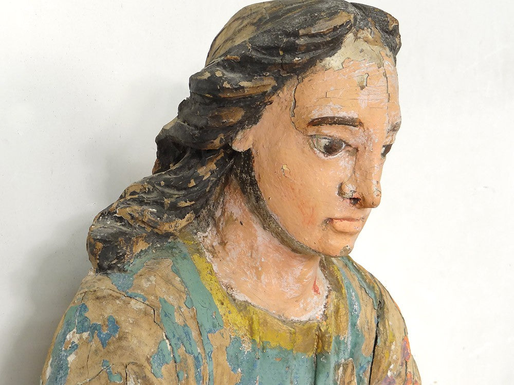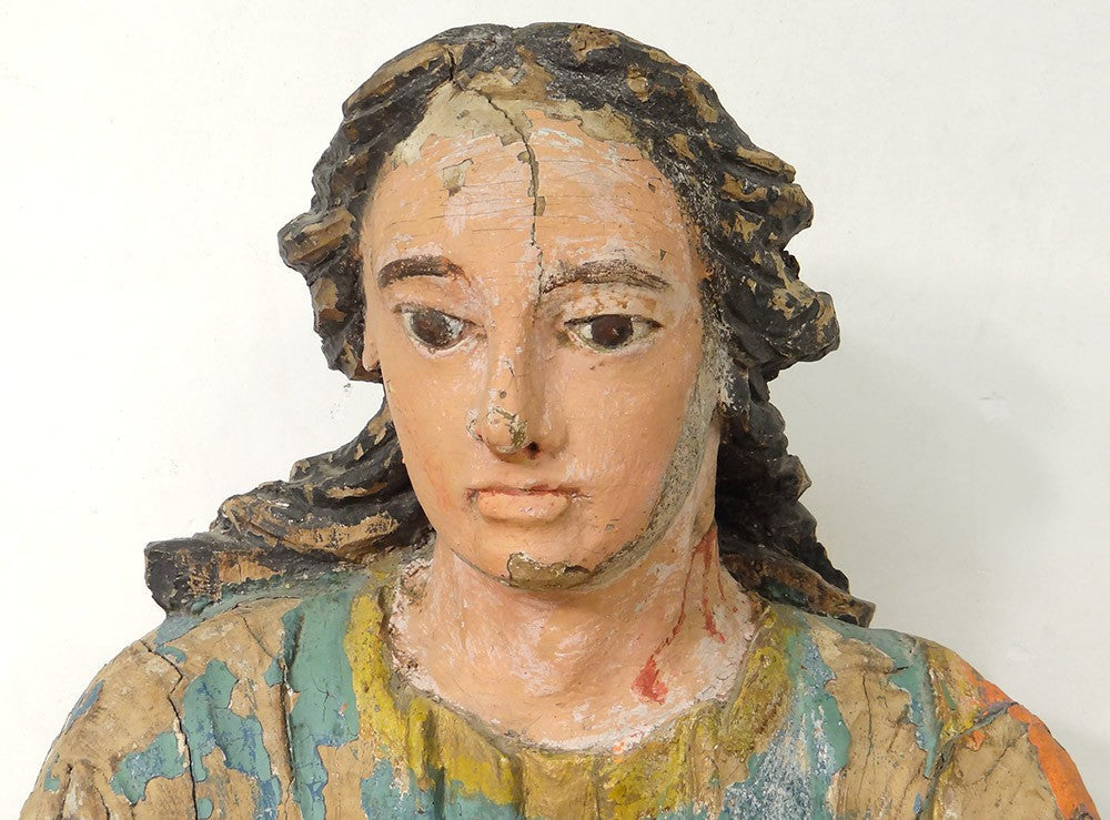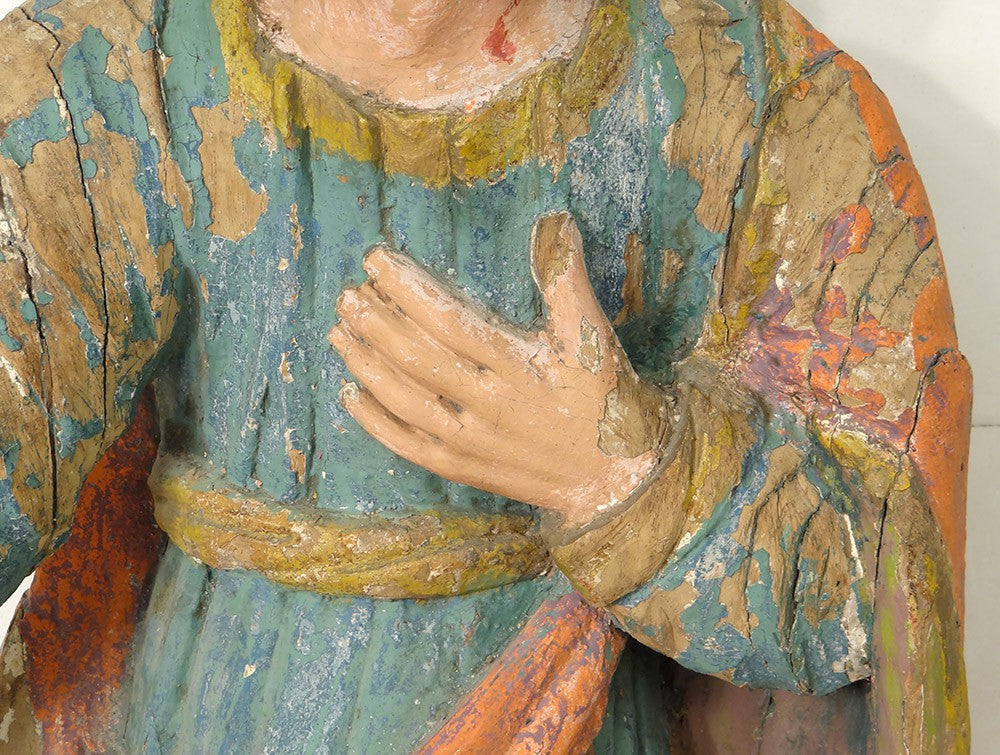 La polychromie ancienne, bien que partiellement altérée, demeure vive et lisible, renforçant le caractère authentique et historique de la pièce.