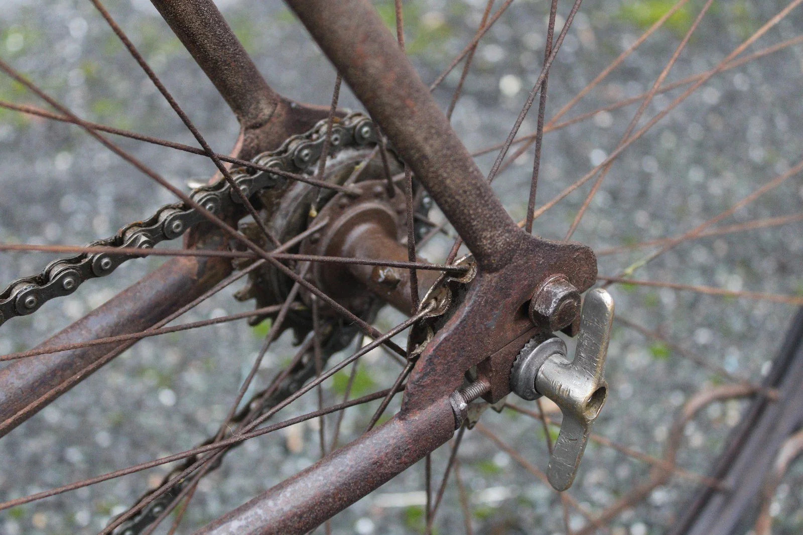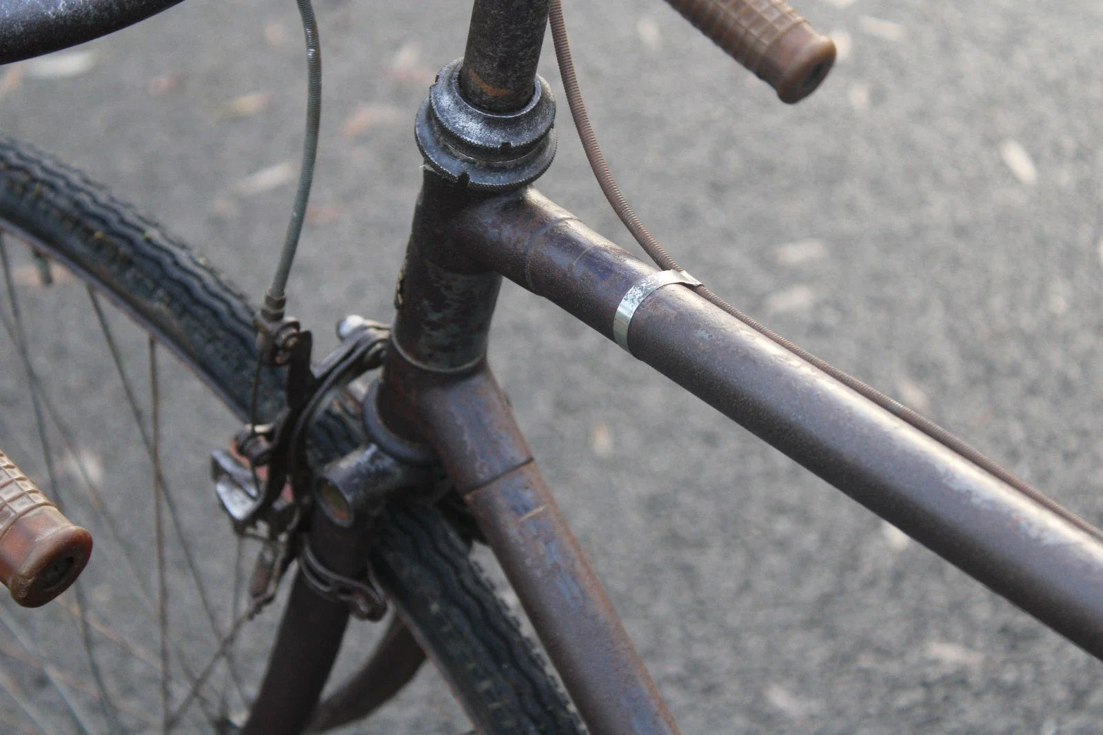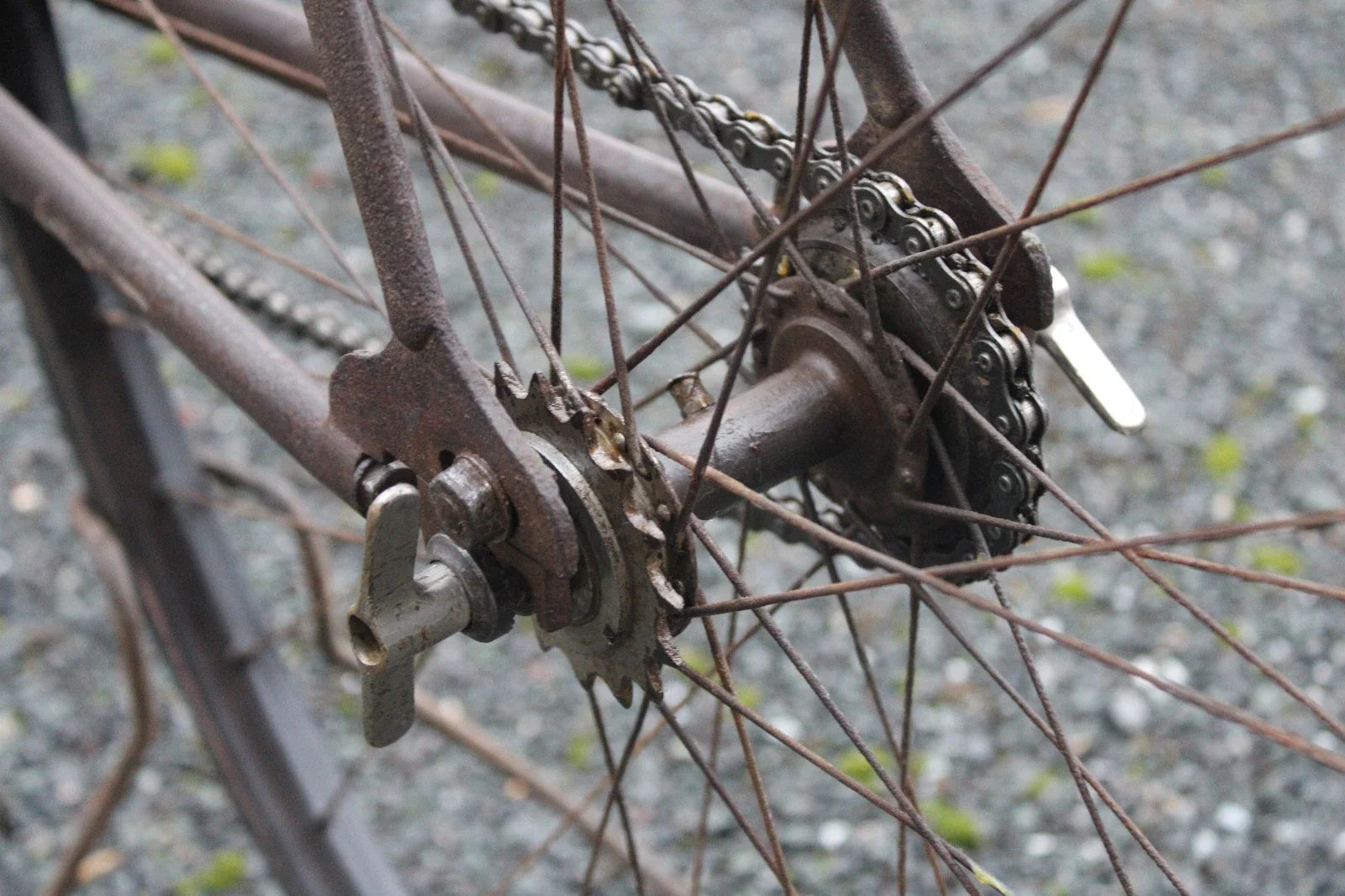 Roues : Jantes 700B étroites (29-30 mm), rayons d’origine un peu oxydés, roue arrière légèrement voilée, moyeux Automoto BH