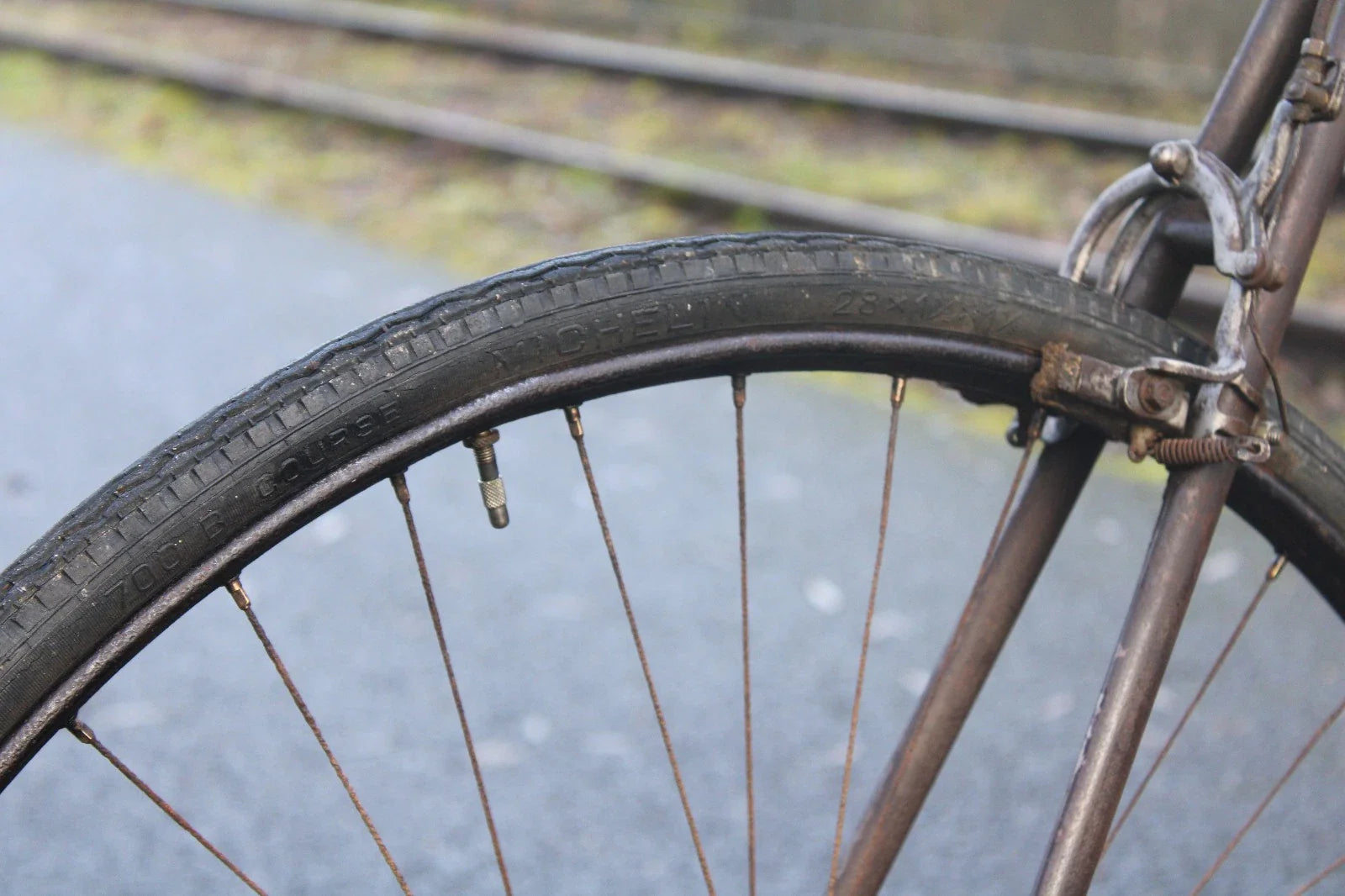 Pneumatiques : Michelin Standard Course (700x30B), roulables mais à conserver pour exposition